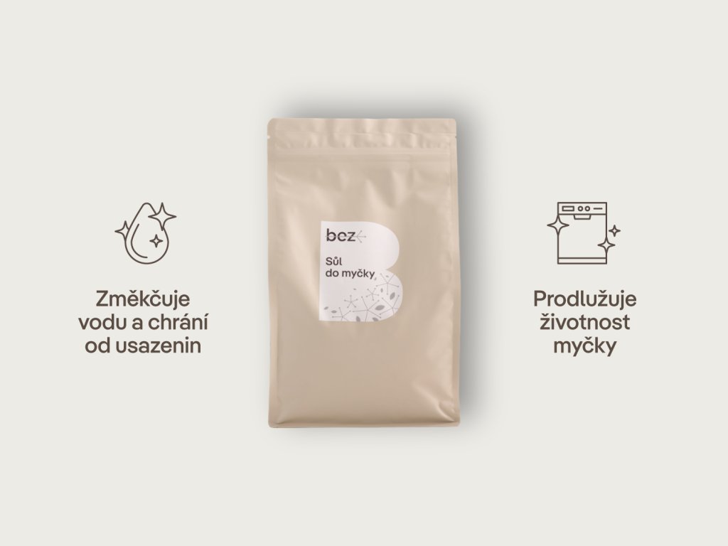 Bez Mořská sůl do myčky je bez příměsí jódu, fluoru a protihrudkujících látek přidávaných do běžné stolní soli. Je bezpečná jak pro vaše nádobí, tak pro myčku, kde plní regenerační funkci. Sodík obsažený v soli pomáhá k regeneraci změkčovače vody, tzv. iontoměniče, který zachycuje ionty vápníku a hořčíku, a tím změkčuje mycí vodu. Bez Mořská sůl do myčky je šetrná i k nejcitlivějším materiálům, navíc ji u nás pořídíte ve zcela recyklovatelných obalech bez negativních dopadů na přírodu.